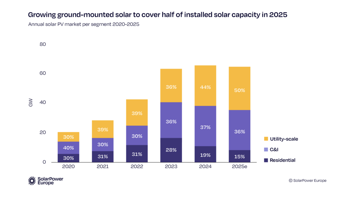 Tras dos años de euforia, 2025 apunta al primer descenso anual en casi una década: 64,2 GW previstos frente a 65,1 GW en 2024, según SolarPower Europe. El frenazo procede del desplome del segmento residencial —con caídas de más del 40% en países como Alemania, España o Polonia—, impulsado por precios eléctricos más bajos y la retirada de esquemas de apoyo. El informe advierte de que esta contracción llega tras un ciclo de fuerte expansión (47% en 2022, 51% en 2023) y puede comprometer la senda hacia los 750 GW que marca Bruselas para 2030. Mientras tanto, el utility-scale gana peso, ya representa la mitad del despliegue y se beneficia de mejores diseños de subastas y de la integración de almacenamiento.