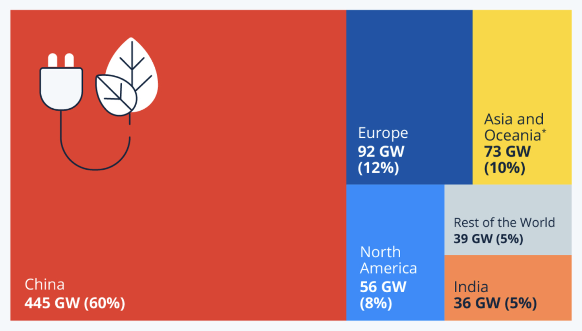 Con una economía aún en expansión y un consumo eléctrico per cápita que se ha multiplicado casi por siete desde el año 2000, China afronta el desafío de cubrir una demanda creciente reduciendo al mismo tiempo su dependencia de los combustibles fósiles. En 2024 añadió 445 GW de capacidad renovable, el 60% de todas las nuevas instalaciones globales, impulsado por planificación a largo plazo, subsidios estatales y un ecosistema industrial que la coloca muy por delante de sus pares.