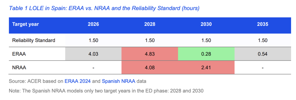 La evaluación de España muestra mayores riesgos de suficiencia de suministro eléctrico para 2030. Si bien los resultados para 2028 están en línea con la evaluación europea, la NRAA estima que para 2030 el país podría experimentar períodos en los que la demanda de electricidad supere la oferta disponible durante más de dos horas al año, por encima del estándar nacional de fiabilidad que establece el nivel objetivo de suficiencia de suministro.