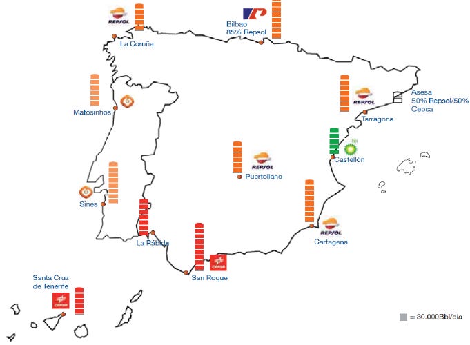 Distribución de refinerías en la Península. (Fuente: Asociación Española de Operadores de Productos Petrolíferos (AOP)).