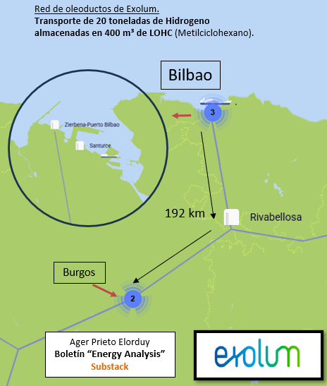 Exolum se encarga diariamente de distribuir los derivados de petróleo a lo largo y ancho de la península ibérica. En esta ocasión, entre paquetes de gasoil, ha distribuido el metilciclohexano a través de la infraestructura existente desde la instalación de almacenamiento de Bilbao hasta la instalación de Burgos (192 km), pasando por Rivabellosa, por una tubería de 14” de diámetro (36 cm). En los 400 m³ de LOHC transportado se almacenaron cerca de 20 toneladas de hidrógeno.
