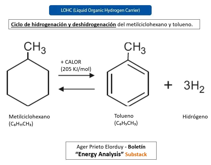 Al hidrogenar el tolueno (C₆H₅CH₃) se logra el metilciclohexano ((C₆H₁₁CH₃), por lo que, durante la hidrogenación saturamos el tolueno eliminando los 3 enlaces dobles y en su lugar se han absorbido 3 moléculas de hidrogeno (H₂). Se podría decir que actúa como una esponja química capaz de almacenar hidrógeno en condiciones ambiente y liberarlo cuando se necesita mediante un proceso de deshidrogenación catalítica. Pero dejando de lado la química, trataré de desgranar el motivo de su elección como liquido portador.