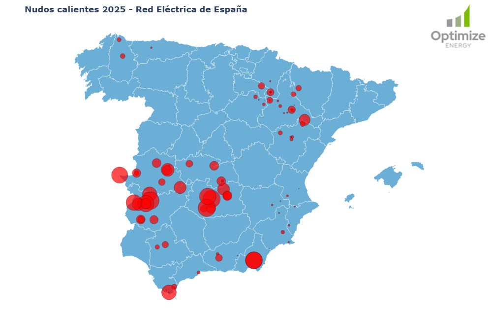Estos serían los grandes ejes del curtailment renovable en España: Extremadura-Ciudad Real, Delta del Ebro y Sur-Sureste, pero quien se lleva la palma sin duda son los nudos fotovoltaicos.