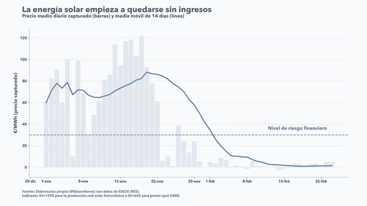 Según datos del mercado, ofrecidos a través de ESIOS y recogidos por Manuel Fernández Ordóñez, el precio capturado en febrero se situaría en los 3,8 €/MWh para aquella fotovoltaica que vende su energía en el mercado spot, también conocido como 'pool'.