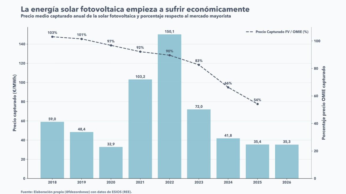Otro apunte interesante para comprender. Los ingresos de la fotovoltaica llevan en continua caída desde 2018 cuando captaron el 103% del precio final del mercado spot. El año pasado capturó el 54% y este año probablemente sea menos, según los expertos.