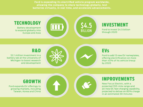 El fabricante de automóviles estadounidense Ford invertirá 4.110 millones de euros (4.500 millones de dólares) en soluciones para vehículos eléctricos hasta 2020. Ford añadirá trece nuevos vehículos eléctricos a su catálogo y, en ese año, prevé que más del 40% de sus modelos cuenten con versiones electrificadas, ha explicado en un comunicado.