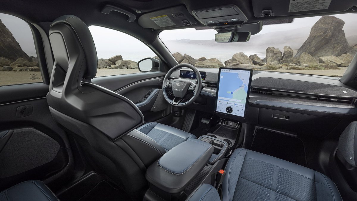 La seña de identidad del Mach-E GT California Special es su carrocería en color exclusivo Azul Adriatic, un tono dinámico y cromático que evoca la energía del océano Pacífico y las puestas de sol californianas. El exterior apuesta además por llantas de 20 pulgadas en gris carbonizado con detalles específicos en azul, gráficos personalizados en el capó y el icónico emblema del pony en un marco anodizado oscuro. La eliminación de las tomas de aire laterales clásicas y la incorporación de cubiertas aerodinámicas en negro brillante aportan un plus de modernidad y eficiencia al diseño.