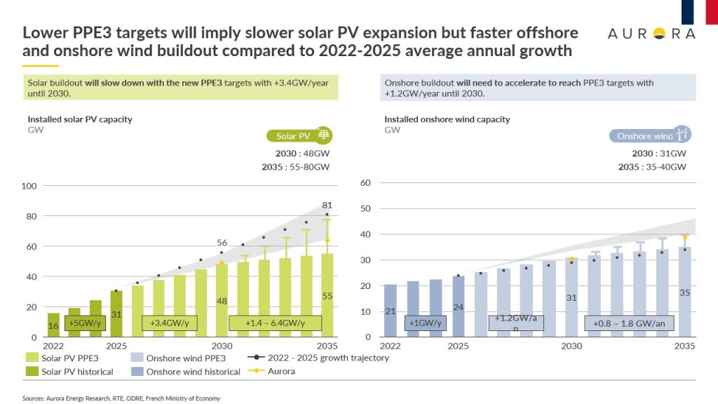 Se fija como meta alcanzar 48 GW de potencia solar y 31 GW de eólica terrestre en 2030, pero no se prevé ningún cierre nuclear antes de 2035 y sí un aumento de la producción, según Aurora Energy Research
