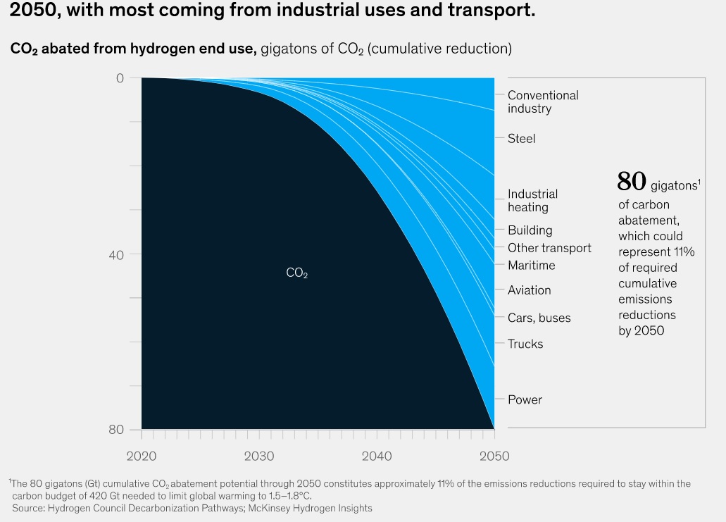 Para 2050, el hidrógeno limpio podría ayudar a reducir siete gigatoneladas de emisiones de CO2 al año, lo que representa aproximadamente el 20 por ciento de las emisiones provocadas por el hombre si el mundo permanece en su trayectoria actual de calentamiento global. Al complementar otras tecnologías, como las energías renovables y los biocombustibles, el hidrógeno tiene el potencial de descarbonizar una variedad de sectores, por ejemplo: industria (fabricación de acero, síntesis de amoníaco para la producción de fertilizantes); movilidad terrestre de largo alcance (como combustible para camiones pesados); transporte marítimo y aviación (para producir combustibles sintéticos para embarcaciones); y calefacción de edificios. El hidrógeno también se puede utilizar para el almacenamiento flexible a largo plazo de las redes eléctricas. La industria y el transporte representan la mayor parte del potencial de reducción del hidrógeno, que tiene una reducción acumulada de emisiones de 80 gigatoneladas de CO 2 hasta 2050.