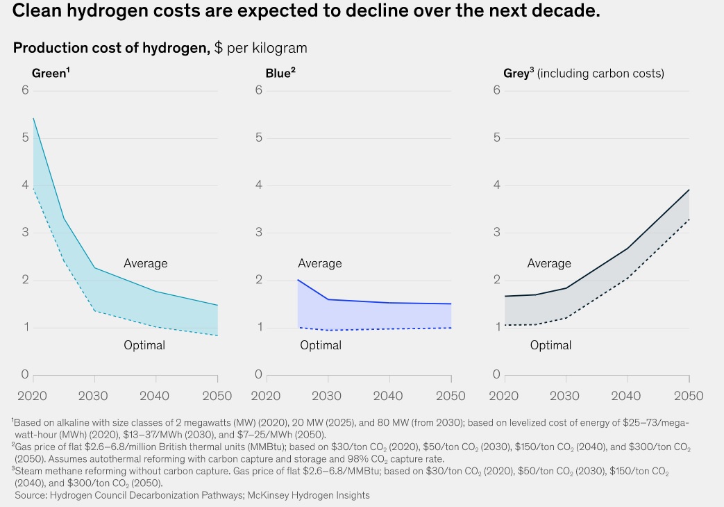 Hoy en día, la mayor parte del hidrógeno se produce con combustibles fósiles, también conocido como hidrógeno gris. Aprovechar el potencial del hidrógeno como herramienta de descarbonización requerirá un aumento significativo de hidrógeno limpio, que se puede producir con energías renovables (a menudo descritas como hidrógeno verde) o con combustibles fósiles combinados con medidas para reducir significativamente las emisiones, como la captura de carbono, la utilización, y almacenamiento (a menudo llamado hidrógeno azul). La demanda de hidrógeno limpio podría crecer a aproximadamente 660 millones de toneladas métricas anuales para 2050. La producción total planificada de hidrógeno verde y azul hasta 2030 ha alcanzado más de 26 millones de toneladas métricas anuales, una cifra que se ha cuadruplicado aproximadamente desde 2020. Los costos de producción de hidrógeno limpio Se espera que el hidrógeno disminuya rápidamente durante la próxima década. A un costo de producción de aproximadamente $2 por kilogramo,