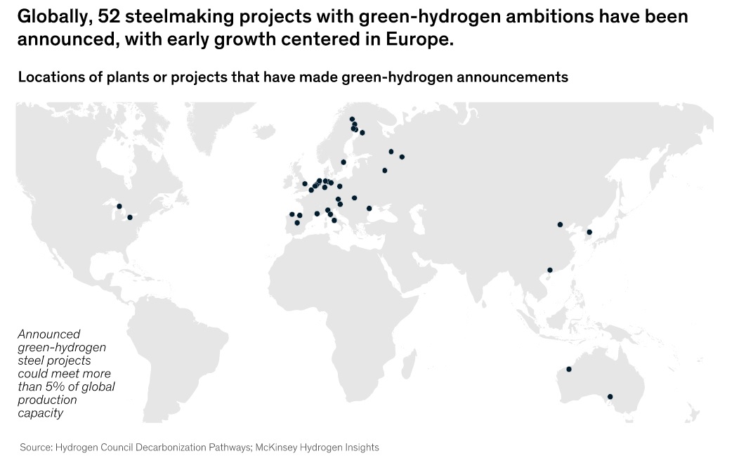 El acero es una de las industrias con mayores emisiones de CO 2 del mundo. En gran parte debido al uso de carbón coquizable en el proceso de producción, el acero representa alrededor del 8 por ciento de las emisiones anuales globales. Si bien requerirá una inversión inicial para hacer la transición, la fabricación de acero a base de hidrógeno tiene el potencial de reducir en gran medida la huella de la industria: se espera que el acero genere alrededor del 8 por ciento de la demanda de hidrógeno limpio en 2030, pero podría representar casi el 20 por ciento de las emisiones evitadas. vía hidrógeno ese año.1 Se han anunciado más de 50 proyectos siderúrgicos con ambiciones de hidrógeno verde en todo el mundo, con Europa como centro de crecimiento inicial.