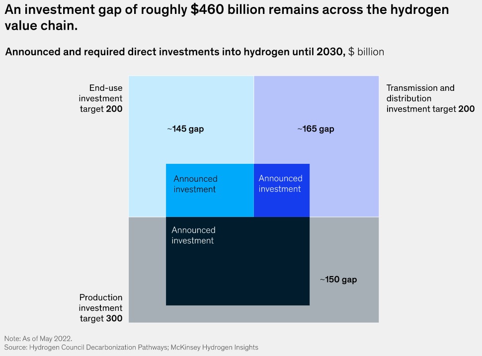 Transporte, distribución y almacenamiento. Las inversiones en esta parte de la cadena de valor son críticas para permitir el acceso a suministros de hidrógeno competitivos en costos, por ejemplo, conectando las regiones con los costos de producción más bajos a los centros de demanda, desarrollando infraestructura de reabastecimiento de combustible para vehículos o construyendo tuberías para abastecer plantas industriales. Queda una brecha de inversión de más de <li>Producción. La producción de hidrógeno limpio tiene la mayor cantidad de inversiones anunciadas; sin embargo, también es el segmento con mayores requerimientos de inversión. La brecha de inversión actual es de aproximadamente $ 150 mil millones hasta 2030.<li>Transporte, distribución y almacenamiento. Las inversiones en esta parte de la cadena de valor son críticas para permitir el acceso a suministros de hidrógeno competitivos en costos, por ejemplo, conectando las regiones con los costos de producción más bajos a los centros de demanda, desarrollando infraestructura de reabastecimiento de combustible para vehículos o construyendo tuberías para abastecer plantas industriales. Queda una brecha de inversión de más de $165 mil millones.<li>Aplicaciones de uso final. Satisfacer la demanda proyectada en las diversas aplicaciones de uso final del hidrógeno, incluida la producción y el transporte de acero, requerirá inversiones adicionales de $ 145 mil millones, con la brecha absoluta más grande en movilidad. Las nuevas aplicaciones de la industria, como el acero, requerirán inversiones significativas, alrededor de $ 35 mil millones, para desembolsos como nuevas plantas. Sin embargo, el acero también es uno de los segmentos más avanzados entre las inversiones anunciadas, con cerca de la mitad de las inversiones requeridas anunciadas.65 mil millones.