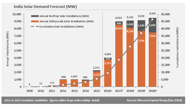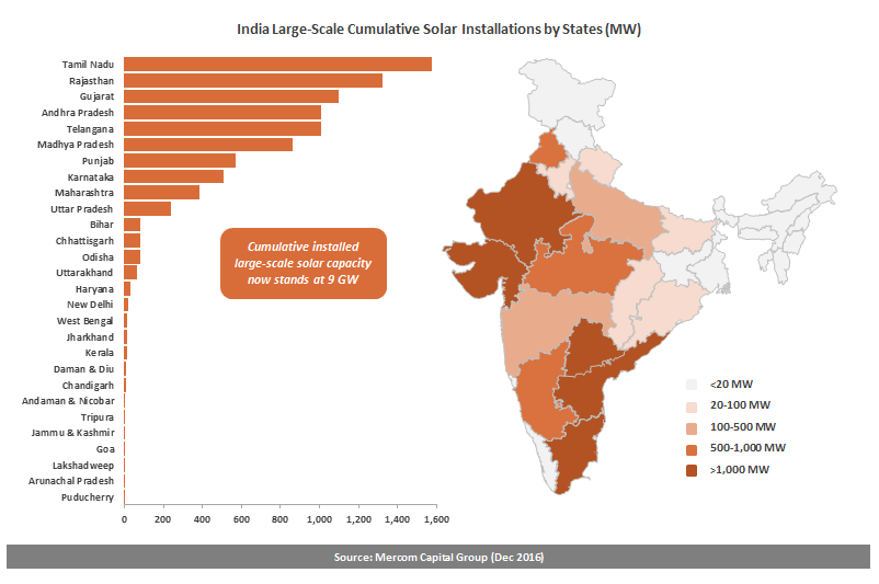 La energía solar representó el 16,7% de la nueva capacidad de generación de energía añadida en 2016 (hasta noviembre), y entre abril y octubre (año fiscal 2016-2017) la producción de energía solar supuso el 1% de la generación eléctrica de la India. Esto puede parecer poco, pero representa un aumento del 50% respecto al año anterior.