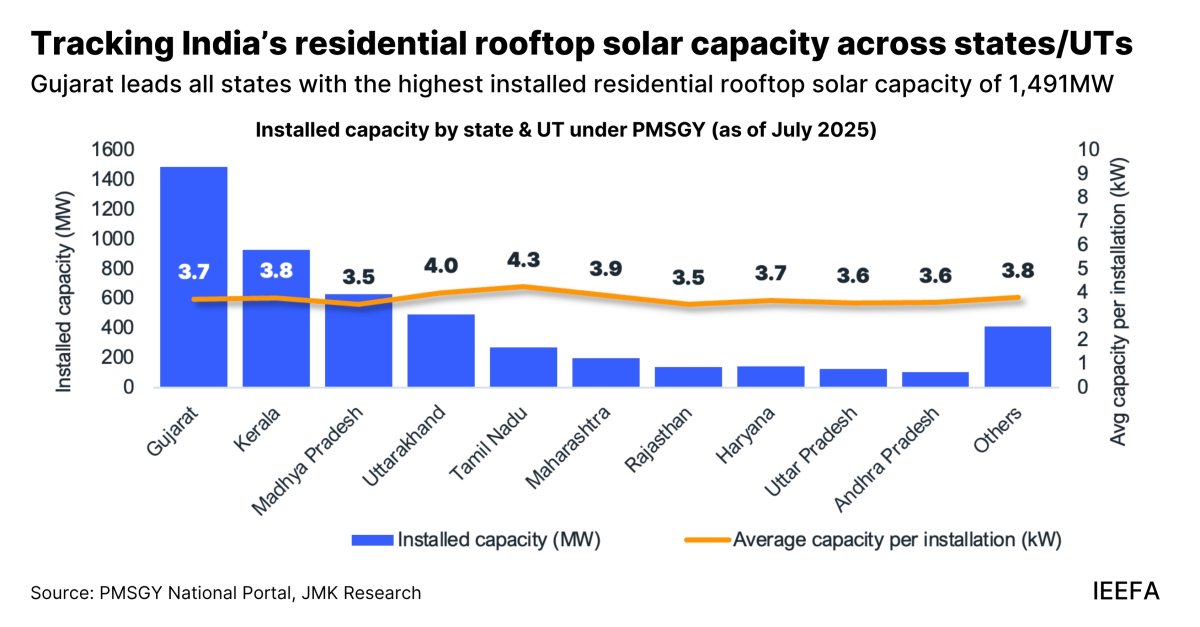 Bajo el PMSGY, Gujarat lidera entre los estados con la mayor capacidad instalada de energía solar en tejados residenciales, con 1491 MW, seguido de Maharashtra, Uttar Pradesh, Kerala y Rajastán. Estos estados, en conjunto, representan aproximadamente el 77,2 % de la capacidad total instalada (4946 MW) bajo el programa hasta julio de 2025.