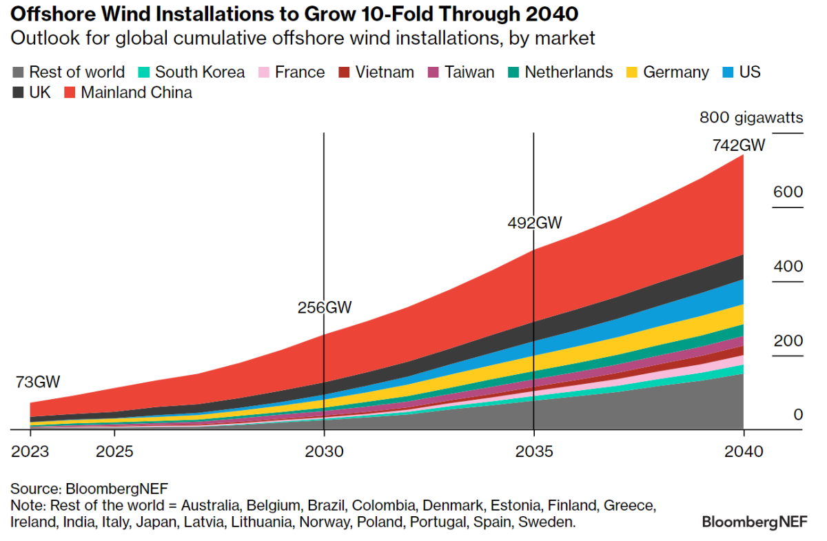 Un nuevo informe de BloombergNEFG muestra que las adiciones de energía eólica marina alcanzarán un nuevo máximo en 2024, a medida que varios mercados más nuevos, incluidos Estados Unidos, Francia y Taiwán, aumenten su construcción.