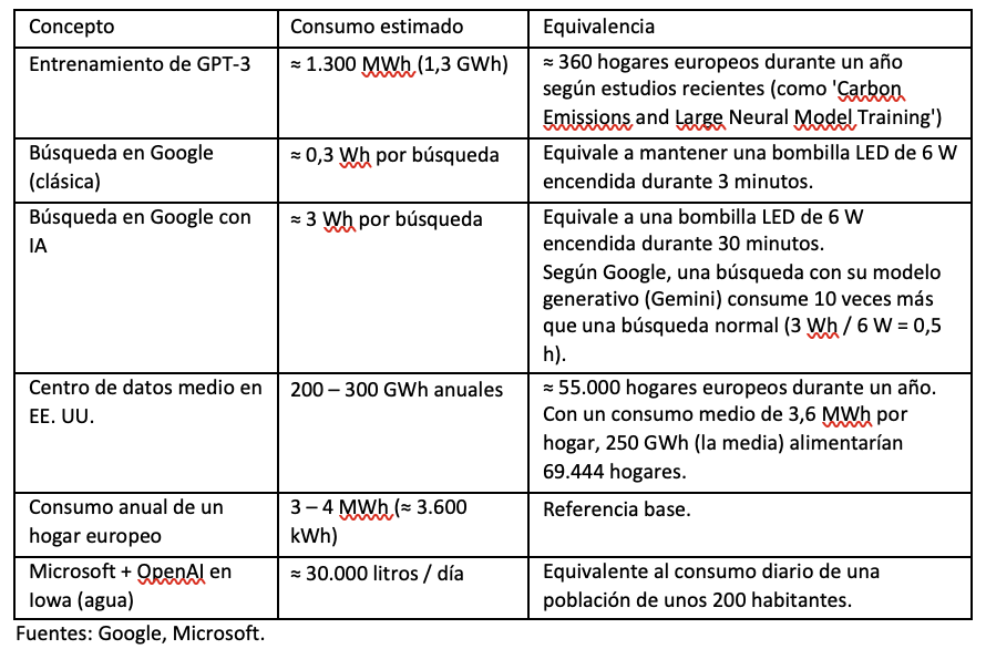 Los datos de Google son aún más reveladores: una búsqueda con IA generativa consume hasta diez veces más energía que una búsqueda convencional en su buscador. El problema se amplifica con el crecimiento exponencial de servicios como ChatGPT, Copilot o Gemini. El entrenamiento de modelos como GPT-3 requirió más de 1 GWh de electricidad, equivalente al consumo anual de cientos de hogares europeos.