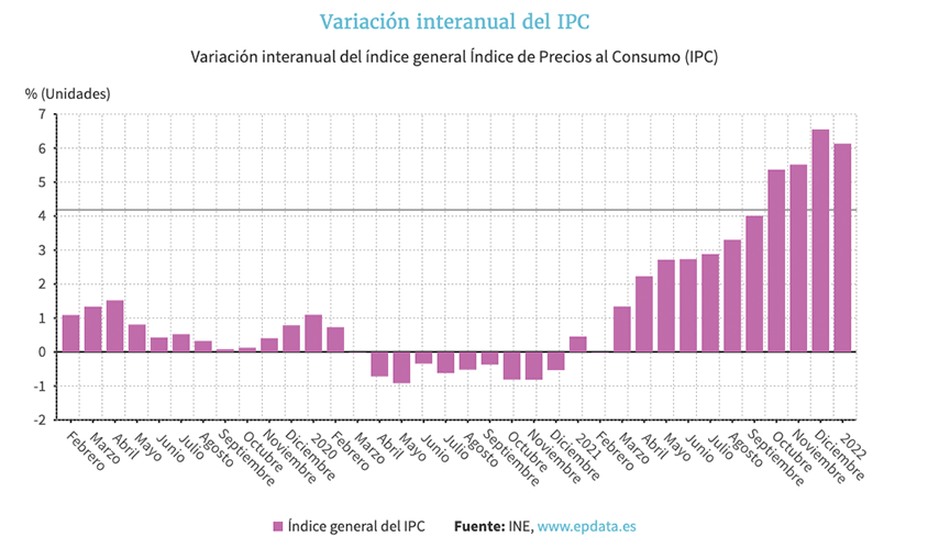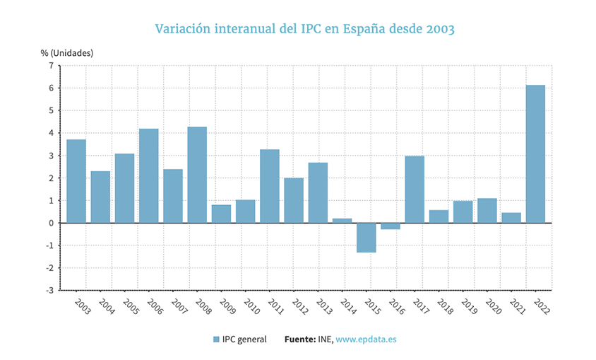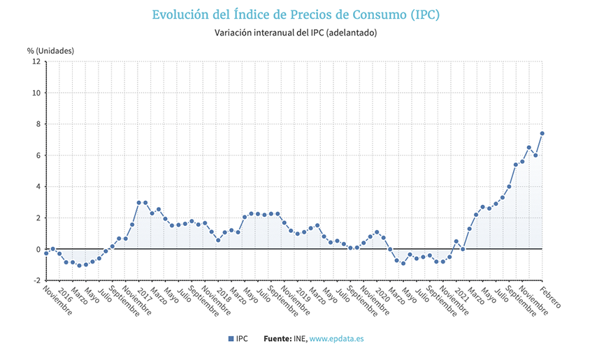 El Índice de Precios de Consumo (IPC) subió un 0,6% en febrero en relación al mes anterior y elevó de golpe su tasa interanual más de un punto, hasta el 7,4%, su tasa más alta en 33 años, concretamente desde julio de 1989.