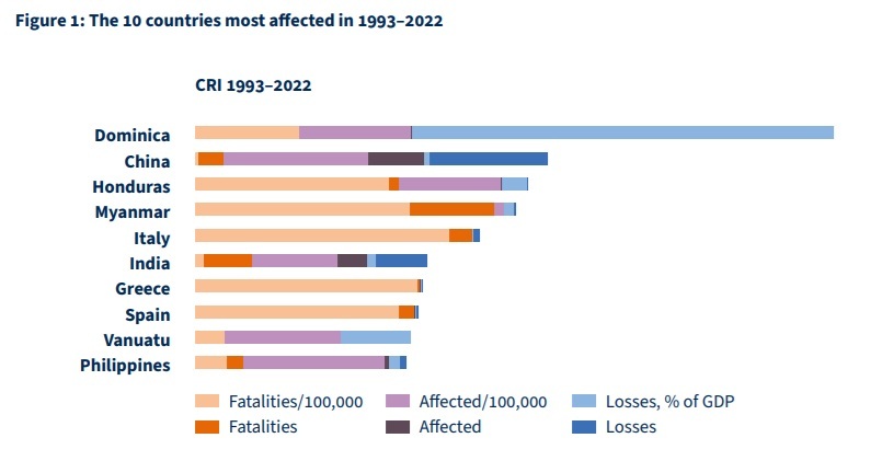 Según el Índice de Riesgo Climático (IRC) publicado por la ONG Germanwatch , Italia, Grecia y España sufrieron sequías e inundaciones extremas en los últimos 30 años, provocando numerosas muertes y elevadas pérdidas económicas. Entre 1993 y 2022, en los tres países mediterráneos se produjeron más de 65.000 muertes relacionadas con fenómenos meteorológicos extremos, mientras que las pérdidas económicas ascendieron a más de 90.000 millones de dólares estadounidenses.