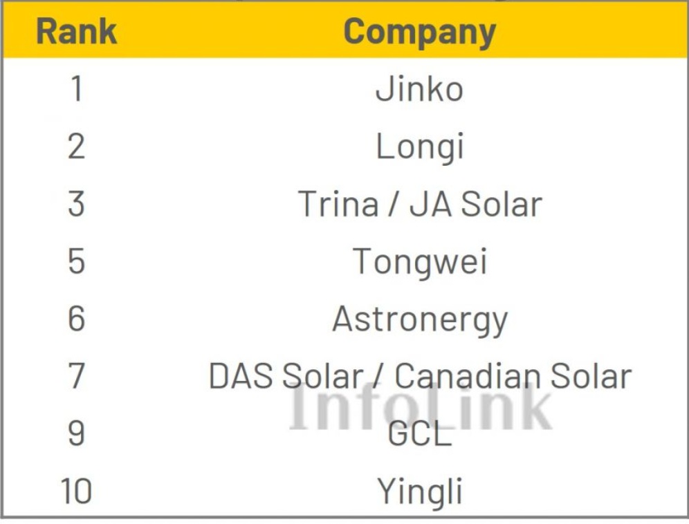 Según los datos de InfoLink, JinkoSolar superó por poco a Longi Green Energy en el primer puesto, mientras que Trina Solar y JA Solar Technology compartieron el tercer puesto. Los cuatro principales fabricantes de módulos representaron casi el 60 % de los envíos, lo que pone de manifiesto la creciente concentración.