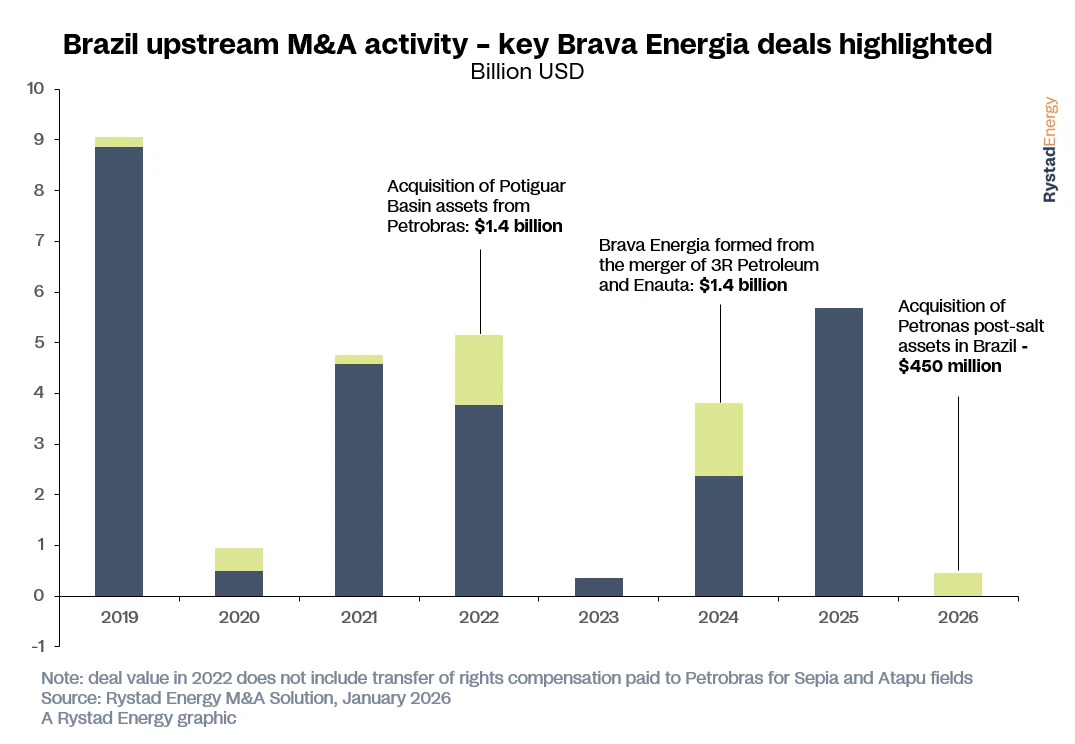Brava Energia se formó en 2024 mediante la fusión de 3R y Enauta, lo que refleja una tendencia de consolidación entre compañías que crecieron de forma inorgánica como parte del programa de desinversiones de activos no estratégicos de Petrobras, controlada por el Estado. El mercado de M&A en Brasil tuvo un 2025 sólido siguiendo esta tendencia, con más de 5.000 millones de dólares en transacciones, siendo la mayor la entrada de PRIO en el activo Peregrino, que implicó la compra de la participación de Equinor y la asunción de la operación. La adquisición por parte de Brava Energia de dos activos en producción refuerza su portafolio y da a 2026 un comienzo fuerte.
