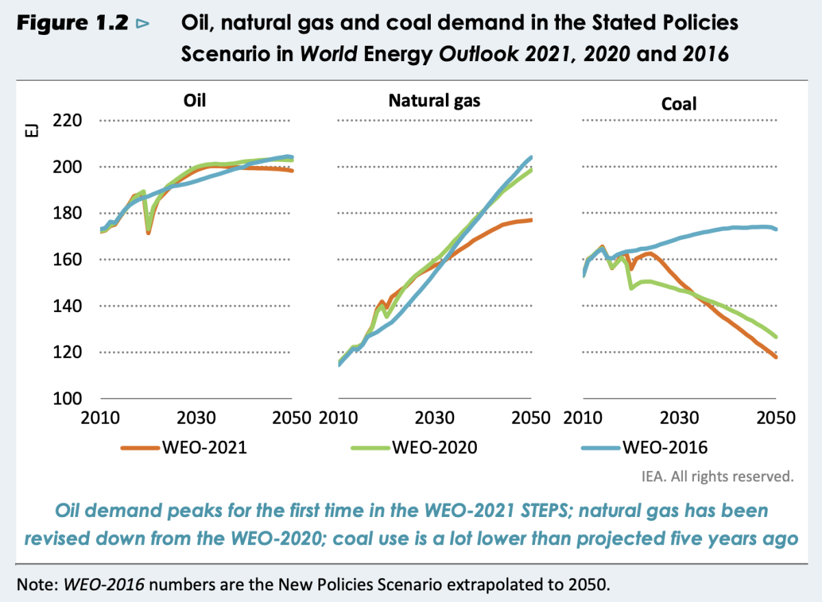 Por primera vez en un informe WEO , la demanda de petróleo experimenta una eventual caída en todos los escenarios examinados, aunque el momento y la velocidad de la caída varían ampliamente. Si se cumplen todas las promesas climáticas anunciadas hoy, el mundo seguiría consumiendo 75 millones de barriles de petróleo por día para 2050, en comparación con los 100 millones actuales, pero eso se desploma a 25 millones en el escenario de emisiones netas cero para 2050. La demanda de gas natural aumenta en todos los escenarios durante los próximos cinco años, pero después de esto hay grandes divergencias.