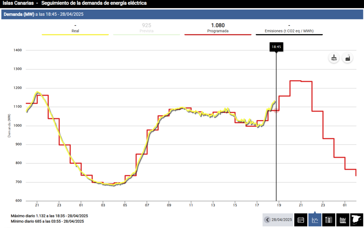 4.Imagen.- Seguimiento de la demanda de la Islas Canarias del 28 abril 2025 (Fuente: Red Eléctrica Española).