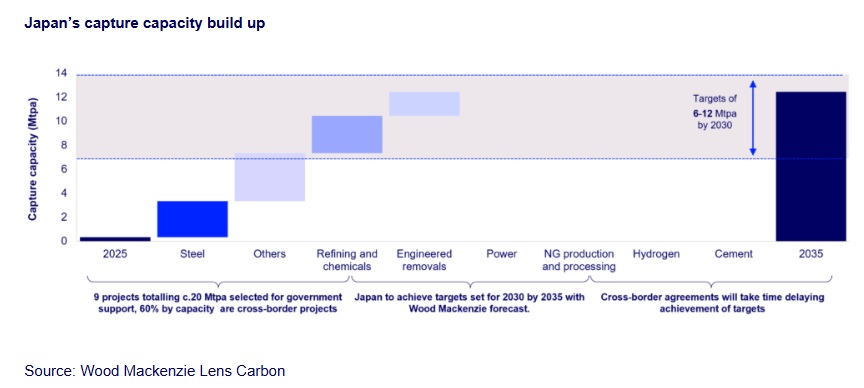 Sin embargo, alcanzar plenamente los objetivos del gobierno requerirá acelerar el desarrollo de asociaciones de almacenamiento transfronterizas. Wood Mackenzie prevé que Japón alcanzará sus metas de 2030 hacia 2035, ya que los acuerdos internacionales necesitarán más tiempo para concretarse.