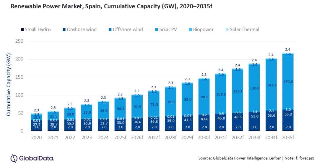 España está reforzando su transición hacia la energía limpia con objetivos ambiciosos en solar, eólica e hidrógeno, respaldados por una fuerte alineación con la UE y reformas nacionales. El país aspira a alcanzar un 81% de generación eléctrica renovable para 2030 y la neutralidad de carbono para 2050, según la última actualización del Plan Nacional Integrado de Energía y Clima (PNIEC). En este contexto, se prevé que la capacidad renovable acumulada de España alcance los 218,1 GW en 2035, con una tasa de crecimiento anual compuesta (CAGR) del 9,1% entre 2024 y 2035, según la firma de análisis y datos GlobalData.