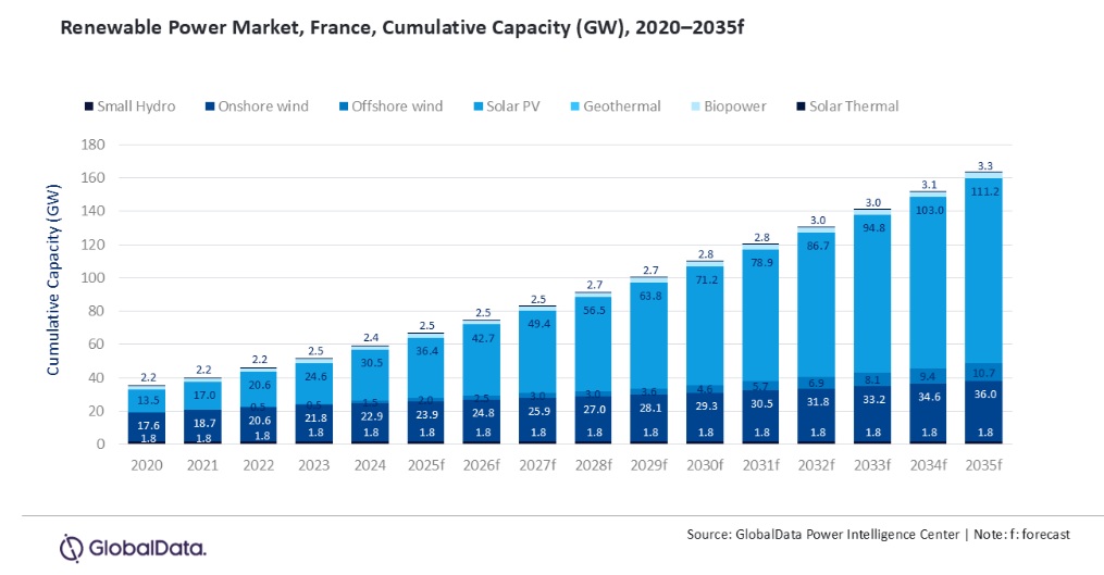 El informe más reciente de GlobalData, “Tendencias y análisis del mercado eléctrico de Francia por capacidad, generación, transmisión, distribución, regulación, actores clave y previsiones hasta 2035”, revela que la energía eólica y solar seguirán siendo los principales motores del desarrollo de las energías renovables en el país.