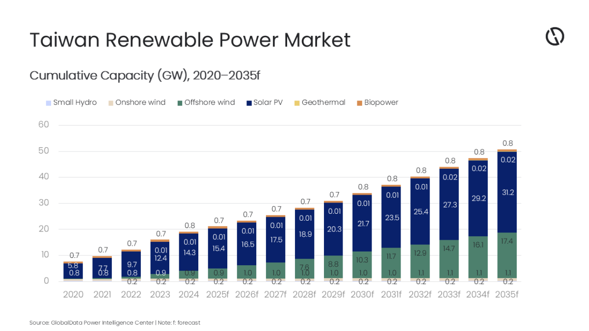 El informe de GlobalData, “Tendencias y análisis del mercado eléctrico de Taiwán por capacidad, generación, transmisión, distribución, regulaciones, actores clave y previsión hasta 2035”, señala que la expansión de la capacidad renovable en Taiwán refleja una inversión sostenida en tecnologías de energía limpia en el marco de la Ley de Desarrollo de Energías Renovables, junto con programas de refuerzo de la red liderados por Taipower para respaldar una mayor penetración de renovables en un sistema aislado.