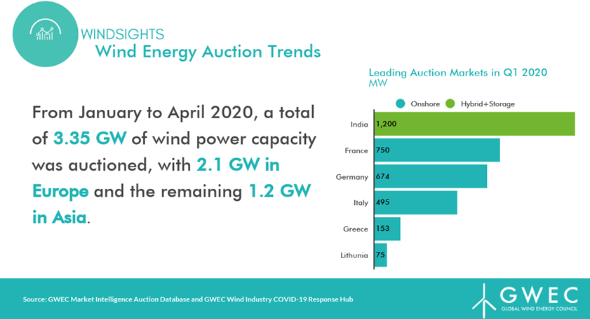 Sin embargo, muchos mercados clave para la energía eólica han continuado sus subastas según lo planeado a pesar de la crisis, lo que será importante para asegurar el crecimiento de la industria. En India, el cuarto mercado eólico terrestre más grande del mundo, se subastaron 1,2 GW de capacidad híbrida renovable para proyectos que incluyen tanto un sistema de almacenamiento de energía como capacidad de energía renovable. El 7 de marzo de 2020 se anunció una licitación por otros 2 GW de capacidad de energía eólica, con la eliminación de los límites de tarifas de la subasta para impulsar la inversión.