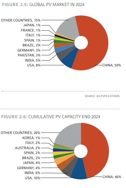 China siguió siendo el mercado dominante, con una instalación de entre 309 GW y 357 GW, representando casi el 60% de todas las nuevas instalaciones. La Unión Europea le siguió con 66 GW, liderada por Alemania (17,2 GW), España (8,7 GW), Italia (6,7 GW), Francia (6 GW) y Polonia (4,2 GW). Estados Unidos instaló 47 GW, un 40% más que en 2023, mientras que India sumó 32 GW. En total, cerca de 35 países ya operan mercados anuales a escala de gigavatios, y más de 40 países cuentan con una capacidad acumulada superior a 4 GWp.