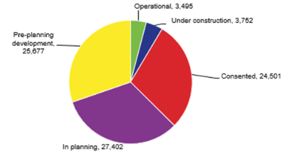 Inglaterra tiene el 60% de la cartera total de proyectos del Reino Unido (50.763MW) incluidos los más altos capacidad de proyectos de almacenamiento de baterías totalmente encargados (2.872 MW). Escocia tiene el segundo mayor proyecto con 29.506 MW.