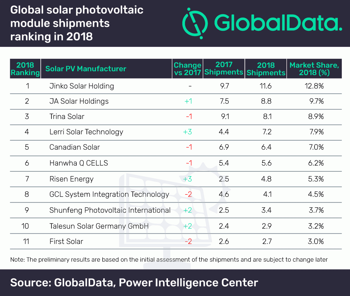 JinkoSolar Holding fue la empresa líder en términos de envíos globales de módulos fotovoltaicos solares (FV) en 2018, según la firma de análisis y datos GlobalData. JinkoSolar encabezó la tabla con 11,6 gigavatios (GW) de módulos fotovoltaicos, seguida por JA Solar, con 8,8 GW. La mayoría de las empresas que figuran en la tabla son de Asia-Pacífico (APAC).