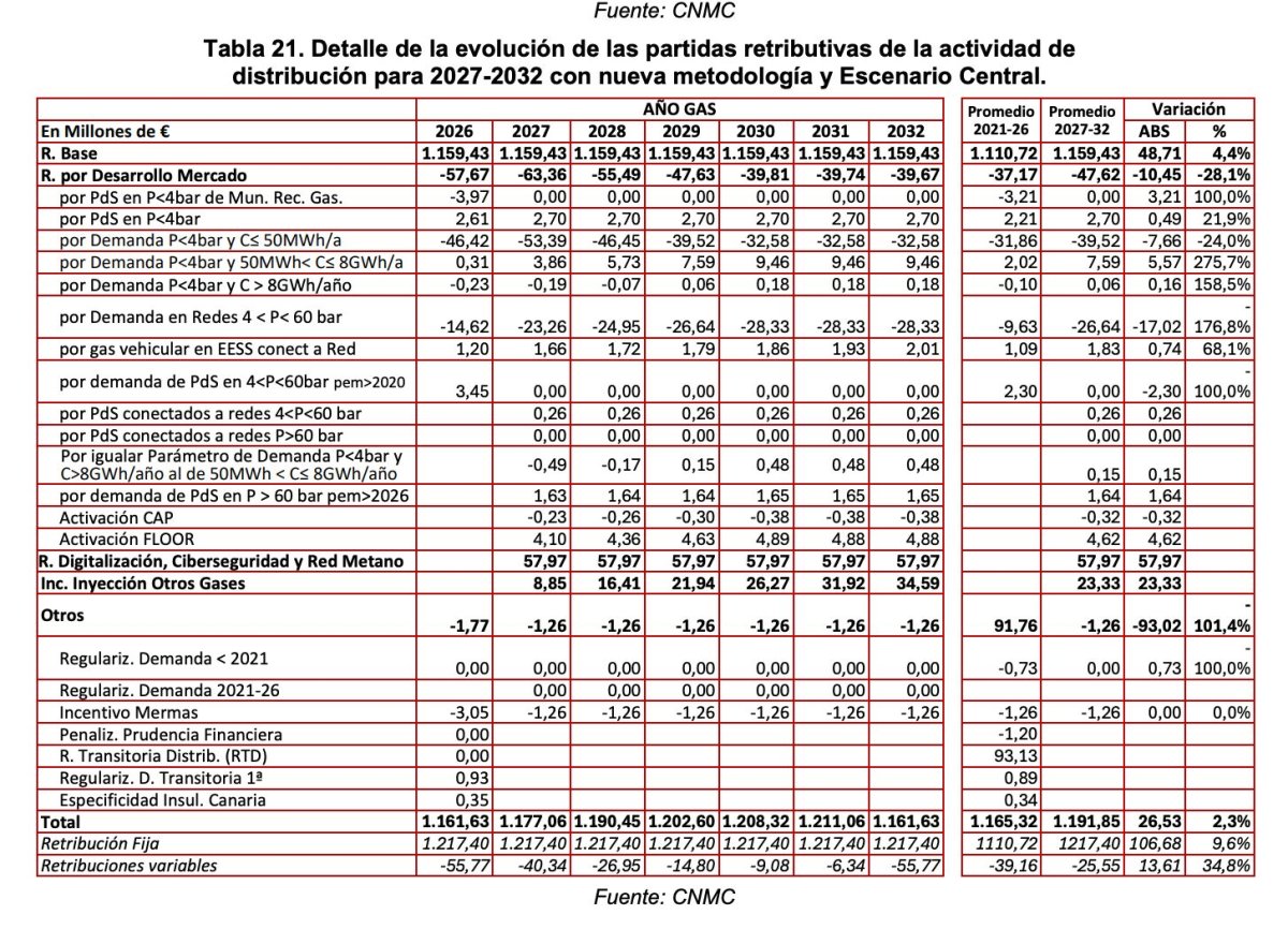 Con todo ello, y teniendo en cuenta los datos ofrecidos en la memoria económica de la normativa, la evolución de las partidas retributivas de la actividad de distribución para 2027-2032 con nueva metodología y Escenario Central alcanzaría una cantidad de casi 1.192 millones de euros anuales, lo que representa un leve incremento del 2,3% frente a lo retribuido en el anterior periodo.