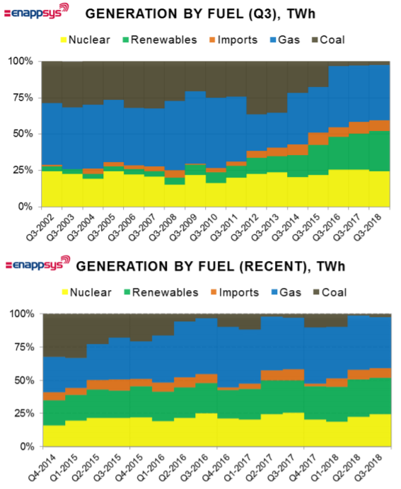 El informe de la firma de análisis británica EnAppSys “Resumen del mercado de electricidad de GB en el tercer trimestre de 2018 (julio a septiembre)” dice que la cuota de participación de los combustibles fósiles del mix de generación británico ha caído por primera vez hasta el 41%, desde el 74% del total en el tercer trimestre de 2010, cuando el gobierno cerró las plantas de carbón y la cuota de energía renovable comenzó a dispararse.