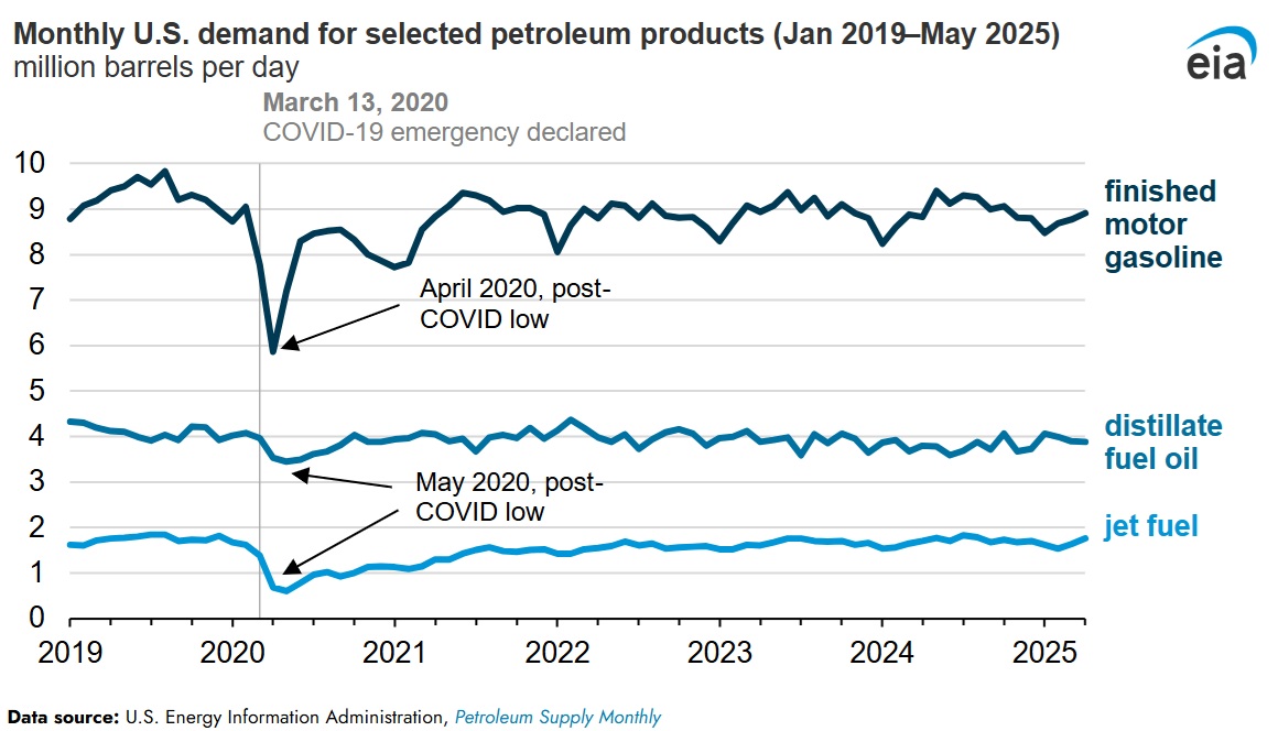 En abril de 2020 (el primer mes completo tras la declaración de emergencia nacional del 13 de marzo), la demanda de gasolina en EEUU cayó a 5,9 millones de barriles por día (b/d), el nivel más bajo desde enero de 1974. En abril de 2025, la demanda promedio fue de 8,9 millones b/d, un 52% más que en abril de 2020, pero aún por debajo del promedio de abril de 2019, que fue de 9,4 millones b/d.