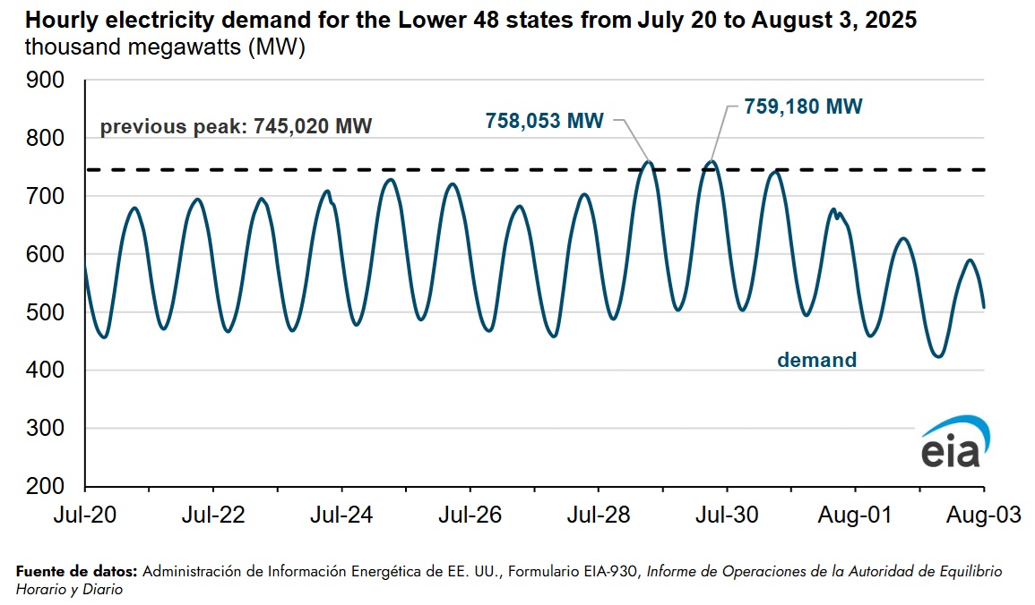 El calor, que incrementa la demanda de electricidad para refrigeración, junto con una tendencia subyacente al alza de la demanda, impulsó la demanda máxima coincidente en los 48 estados continentales a un máximo de 758.053 megavatios (MW) el 28 de julio, entre las 6:00 p. m. y las 7:00 p. m., hora del este, según los datos preliminares del Monitor Horario de la Red Eléctrica de a Adiministración de Información Energética de EEUU (EIA).