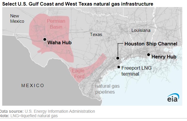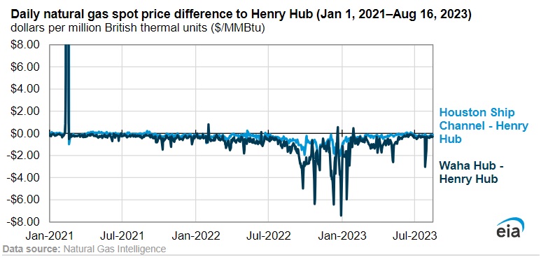 En 2021, alrededor de 8,5 Bcf / d de nueva capacidad de tubería de gas natural entró en servicio en Texas. Un poco menos de la mitad (4,1 Bcf/d) de esa capacidad permitió a los productores de la región del Pérmico aumentar las entregas de gas natural a las regiones consumidoras a lo largo de la costa del Golfo. El aumento de las entregas de la región del Pérmico, combinado con el cierre en junio de 2022 de la terminal de exportación de GNL de Freeport, dio lugar a una oferta de gas natural superior a la demanda en el mercado del este de Texas. Las diferencias entre los precios del Houston Ship Channel y del Henry Hub aumentaron en el 2S22.