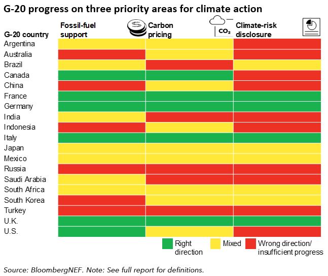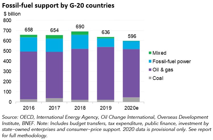 Los países del G-20 han sido noticia en los últimos meses por algunas nuevas promesas de lograr emisiones de CO2 "netas cero" para 2050 o, en el caso de China, para 2060. Pero, la realidad es que muchas de estas naciones siguen proporcionando una financiación importante para la producción y el consumo de combustibles fósiles. Solo en 2020, el G-20 proporcionó colectivamente casi 600.000 millones de dólares en subsidios y otros apoyos para estas actividades, estima BloombergNEF.