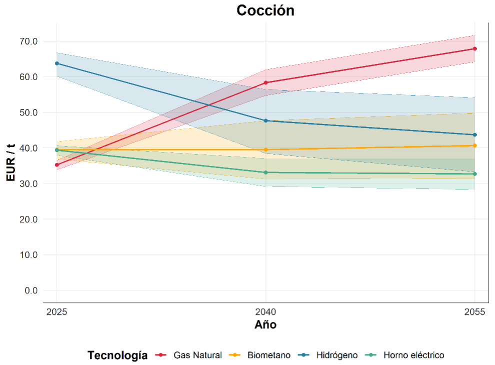 Figura 1: Coste nivelado de la cocción (EUR/t) por tecnología y año, con sensibilidad al precio de la energía.