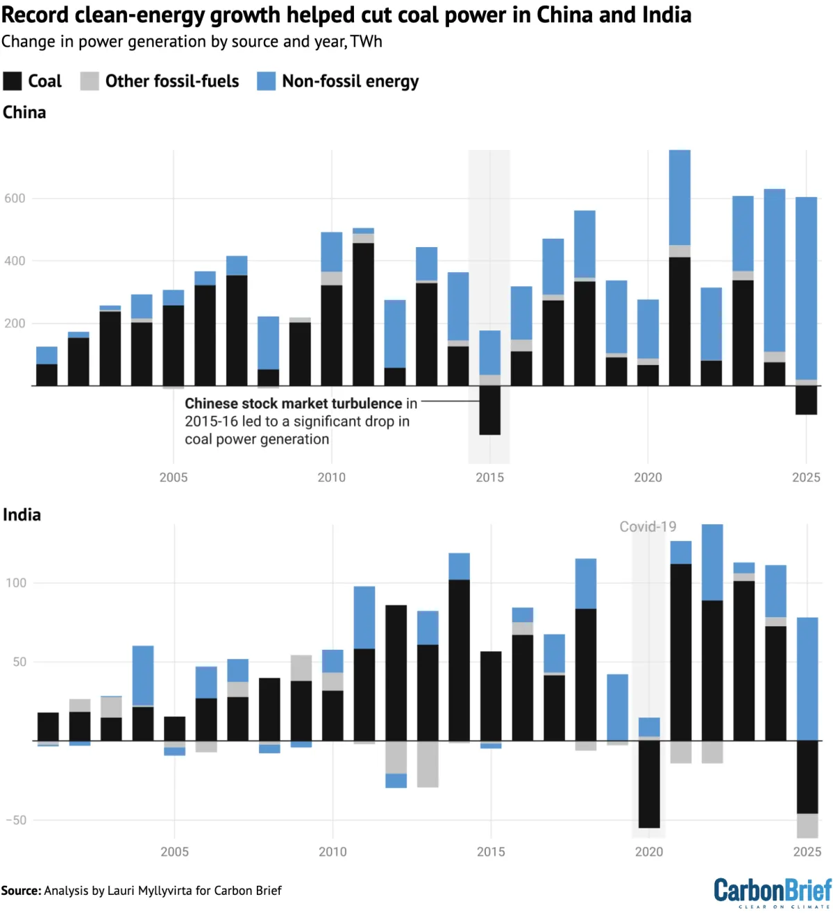 El nuevo análisis muestra que la generación eléctrica a partir de carbón cayó un 1,6% en China y un 3,0% en India en 2025, ya que las fuentes de energía no fósiles crecieron lo suficientemente rápido en ambos países como para cubrir el aumento del consumo eléctrico. Esto se ilustra en la figura siguiente.