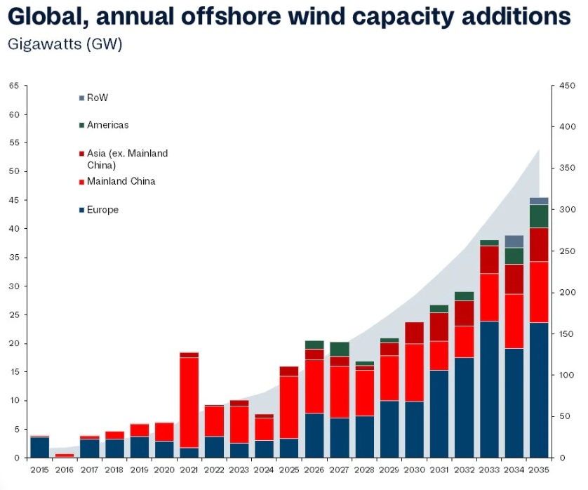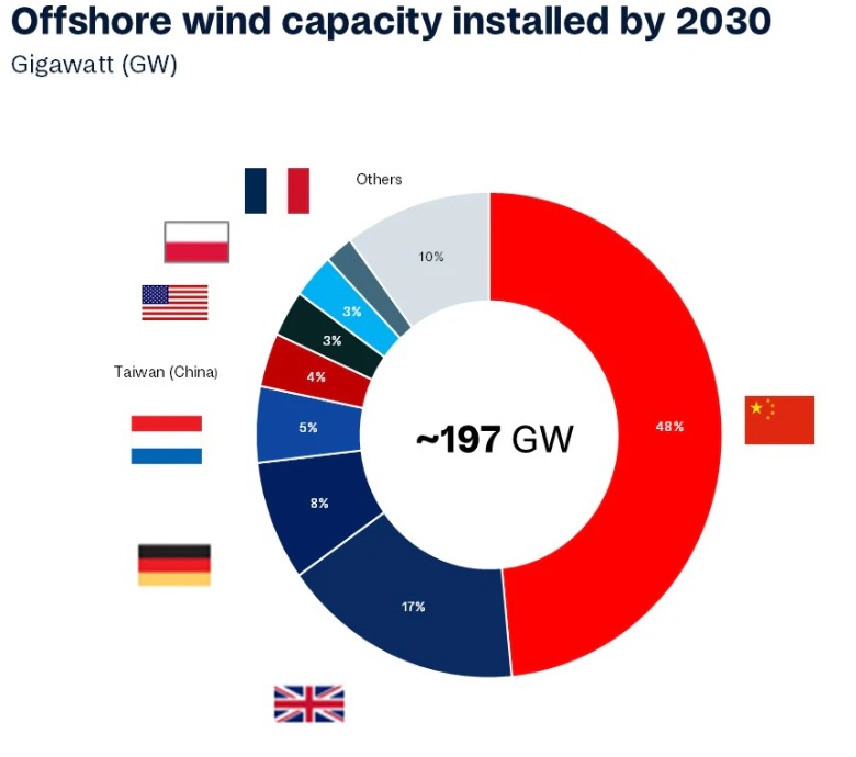 A pesar de las condiciones desfavorables en EEUU, investigaciones de Rystad Energymuestran que la nueva capacidad eólica marina global alcanzará los 16 gigavatios (GW) para finales de 2025 gracias a proyectos ya en marcha, dos tercios de los cuales se están desarrollando en China. Para 2030, Rystad Energy pronostica que los proyectos de energía eólica marina en China representarán el 45% de la capacidad acumulada mundial, lo que dificultará que el mercado estadounidense pueda competir a largo plazo, independientemente de posibles cambios en sus políticas.