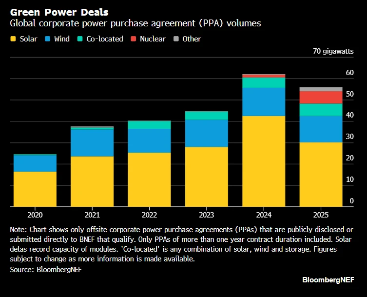Las grandes empresas tecnológicas tienen un enorme apetito por la energía limpia. Gigantes tecnológicos como Meta, Amazon, Google y Microsoft representaron aproximadamente la mitad de los 56 gigavatios en acuerdos de compra de energía limpia firmados en 2025. La mayor parte de esta actividad tuvo lugar en Estados Unidos, donde los acuerdos representaron el 76% del total del mercado, de unos 30 gigavatios.