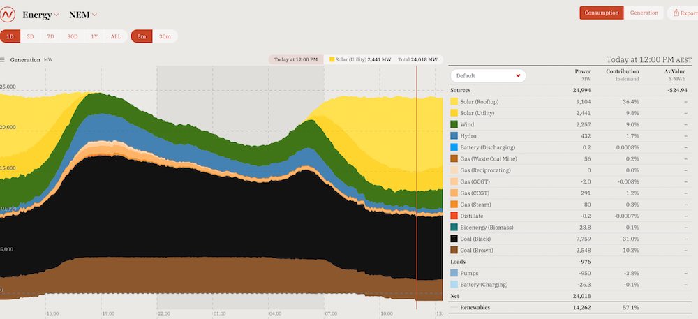 Como se puede ver en el gráfico anterior de OpenNEM, al mediodía del miércoles, la energía solar en la azotea suministraba el 34,6% del mix de generación total en el NEM, mientras que la energía solar a gran escala suministraba el 9,8%, la energía eólica el 9,6% y la hidroeléctrica el 1,7%.