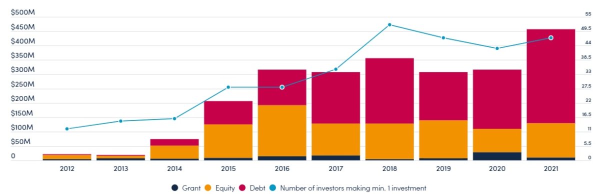 Históricamente, las empresas de energía solar fuera de la red en fase semilla y de puesta en marcha han dependido de la financiación mediante subvenciones para afinar sus modelos de negocio y obtener los puntos de prueba requeridos por los inversores de capital y deuda con una orientación más comercial. En 2021, el sector atrajo alrededor de $ 10 millones en subvenciones, que se dirigieron a empresas de uso productivo en etapas más tempranas y aquellas que son de propiedad y administración local.