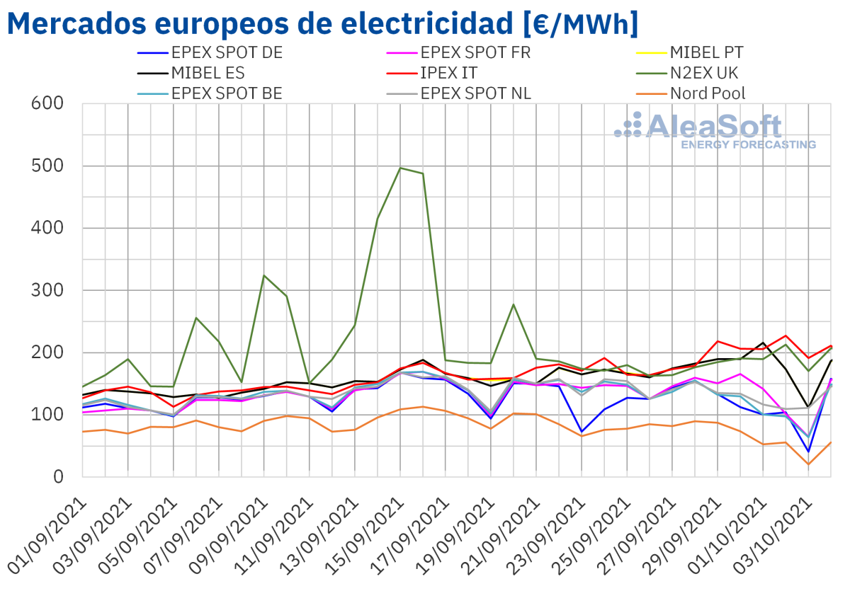 Por lo que respecta a los precios horarios, el 2 y el 3 de octubre se registraron precios horarios negativos en el mercado belga. El domingo 3 de octubre también hubo precios negativos en los mercados de Alemania, Francia, los Países Bajos y los países nórdicos. En este último mercado no se registraban precios horarios negativos desde noviembre de 2020. Por otra parte, en el caso del mercado de los Países Bajos, ese mismo día 3 de octubre, se alcanzaron el segundo y el tercer precios horarios más altos al menos desde abril de 2011. Otros mercados europeos también alcanzaron precios horarios máximos en la semana del 27 de septiembre. El martes 28 de septiembre, en los mercados alemán y francés se alcanzó un precio horario de 237,01 €/MWh, el cual fue el más alto desde noviembre de 2008 en Alemania y desde noviembre de 2018 en Francia. El sábado 2 de octubre, en Italia se registró el mayor precio horario desde agosto de 2012, de 290,00 €/MWh. Mientras que en el mercado MIBEL se alcanzó el mayor precio horario de su historia, de 249,00 €/MWh, el lunes 4 de octubre.