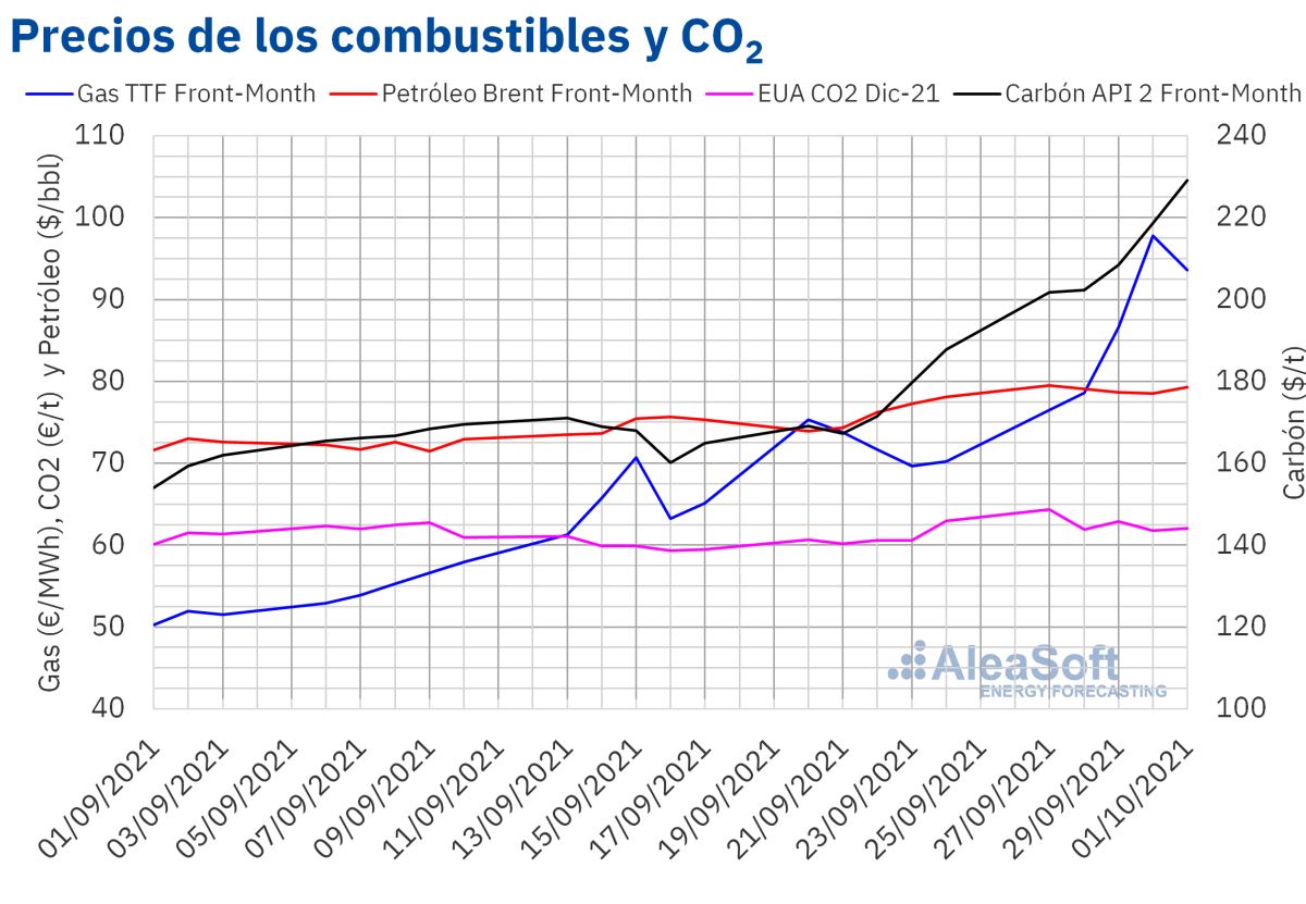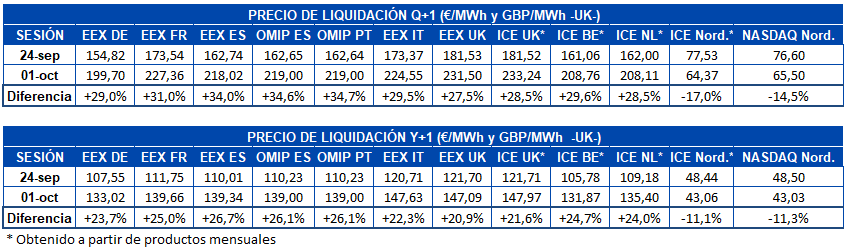 En la semana que dio cierre a septiembre e inicio a octubre volvieron a registrarse récords del gas y CO~2~, propiciando que en algunos mercados eléctricos se alcanzaran máximos históricos horarios o diarios y que los futuros de electricidad subieran en la mayoría de los casos. Sin embargo el aumento de la producción eólica propició que los precios bajaran en varios mercados spot e incluso llegaron a registrarse precios negativos en algunas horas del fin de semana. La demanda subió en la mayoría de mercados.