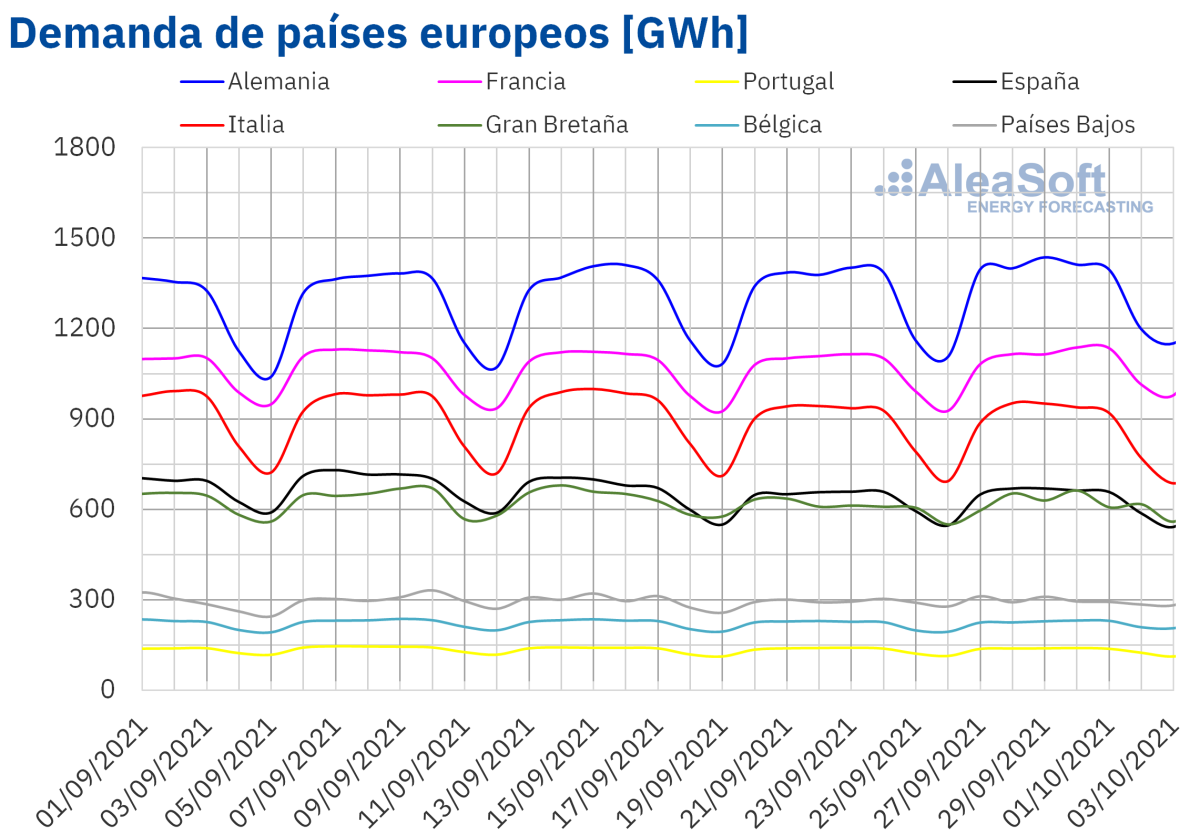 En la semana del 27 de septiembre, la demanda eléctrica se recuperó respecto a la semana anterior en la mayoría de los mercados eléctricos de Europa. Los mercados de Bélgica, Francia, Gran Bretaña y Alemania registraron incrementos entre un 1,7% y 2,5%. En los mercados de la península ibérica y Países Bajos hubo subidas inferiores al 1,0%. Por otro lado, en el mercado italiano se registró un descenso del 0,5%.