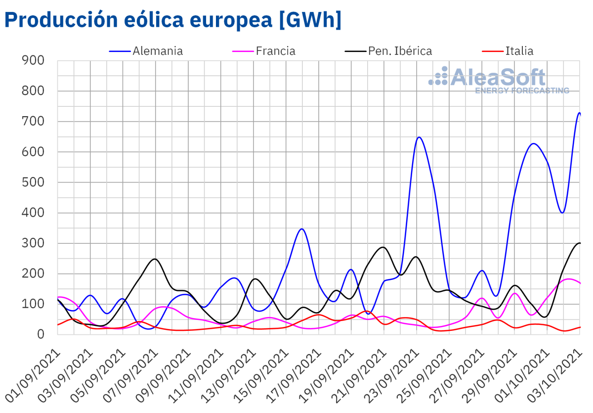 Durante la última semana de septiembre, la producción eólica aumentó un 185% en el mercado francés y un 68% en el mercado alemán en comparación con la semana anterior. En los mercados de Italia, España y Portugal la producción con esta tecnología cayó entre un 24% y un 25%. En el caso del mercado ibérico, aunque en el conjunto de la semana la producción eólica disminuyó, el fin de semana aumentó de forma considerable. El promedio de la producción del sábado y domingo fue un 153% superior al promedio registrado entre el lunes y viernes de esa semana.